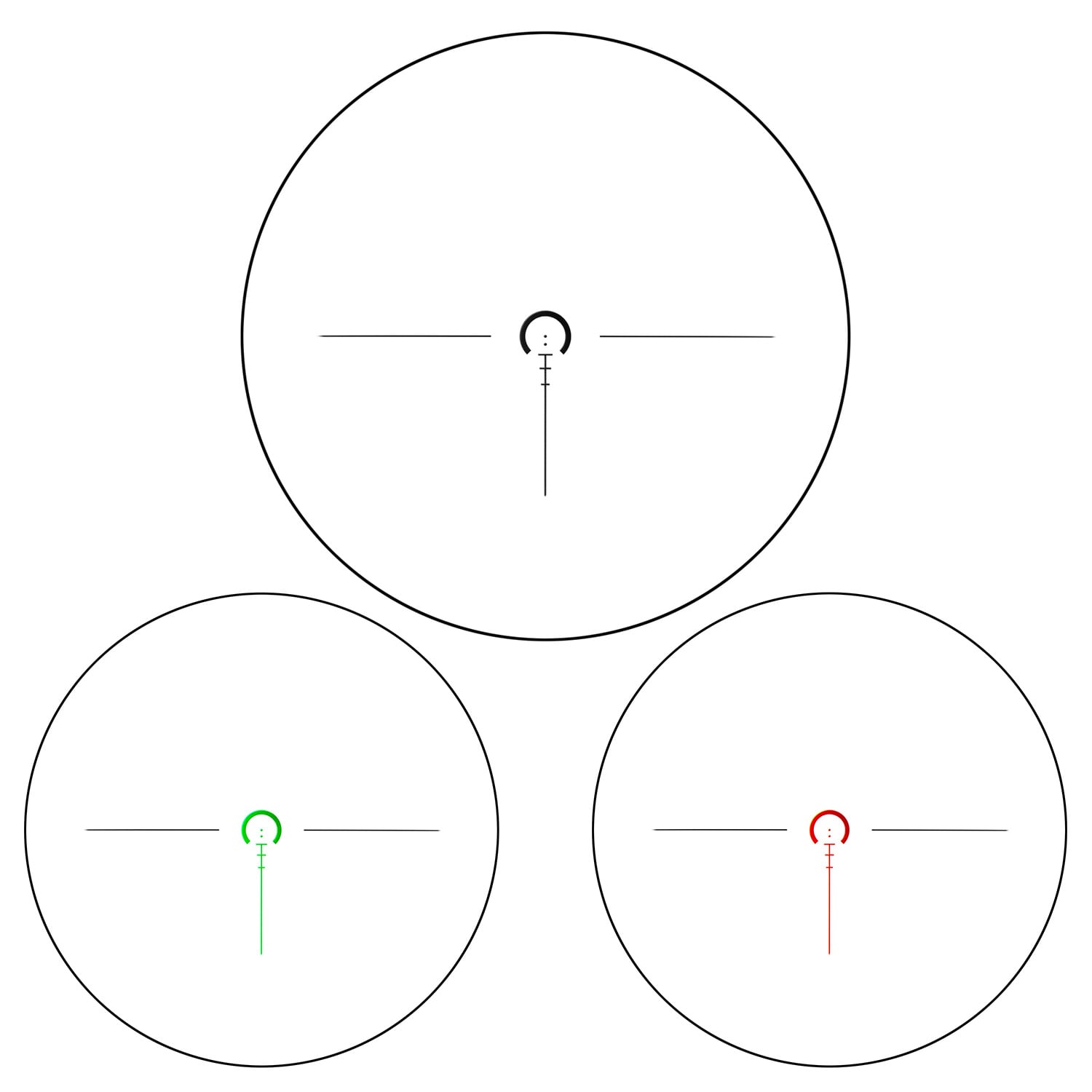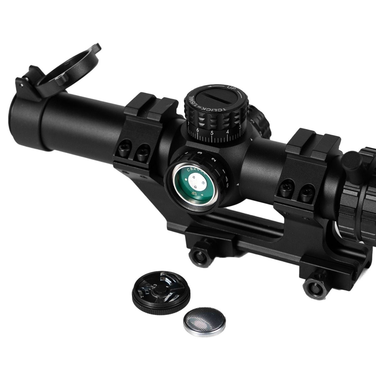 - Illuminated reticle. Green & Red. Needs a CR2032 Battery.